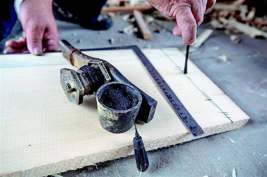 图为:木匠使用墨斗在木板上做标记。武当古建修复尽可能使用传统工艺。 “以不负历史、不辱使命的责任感,以对历史、对祖先和子孙后代负责的态度,保护好这些珍贵的不可再生的文化资源和民族瑰宝。”10月30日,秋阳暖照,武当山仁威观文物保护工程项目现场,一块醒目的标志牌悬挂在入口处,上面的文字道出了武当山古建修复的核心理念。 武当山古建筑群,始建于唐,盛于明,现存古建及遗址66处,建筑面积2.7万平方米,占地面积20多万平方米。“游客们看到的是飞檐斗拱、彩绘朱墙,在这背后,是文物修复专家精心测绘、反复论证、谨慎施工,最大程度还原历史的努力。”武当山文物宗教局文物修复总工程师任鹏飞说。