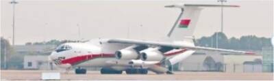 白俄罗斯 伊尔-76四发重型喷气式运输机 垂直尾翼上印有该国国旗图案。白俄罗斯国旗呈长方形,旗面上半部为红色宽条,下半部为绿色窄条,旗面一侧为带红白花纹的竖条。